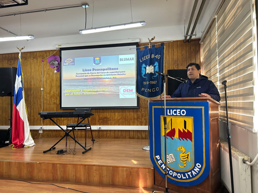 “Gracias a Blumar hemos podido generar vínculos más profundos y, en este caso, hemos hecho un proceso de capacitación y certificación a nuestros estudiantes para conocer y tener el bagaje de lo que significa estar en los centros de cultivo del sur. Para nosotros reviste una importancia enorme, porque nos abre las puertas de los sistemas productivos y nos permite entregar más herramientas a nuestros estudiantes”, destacó el director del establecimiento.